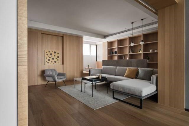 2. 玄關左側為客廳。客廳以原木色為主色調,木色的牆地面,搭配高級灰的沙發與地毯,給人一種低調內斂、舒適自然的空間格調。