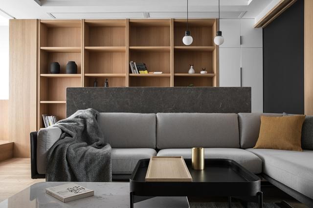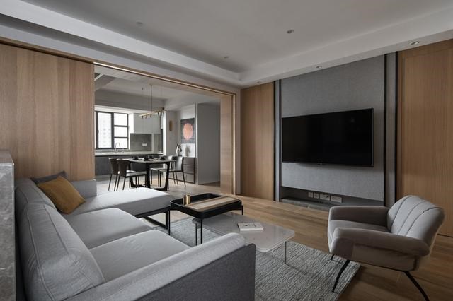 3. 電視背景牆採用高級灰+原木色的拼接設計,並用黑色框線勾勒層次,讓整個空間簡約而優雅。為改善客廳的採光不足,所以將書房與陽台,書房與客廳全部打通,讓從書房陽台引入的光線,照亮整個客廳空間。